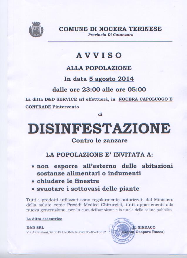AVVISO DISINFESTAZIONE GIORNO 4 / 5 AGOSTO 2014