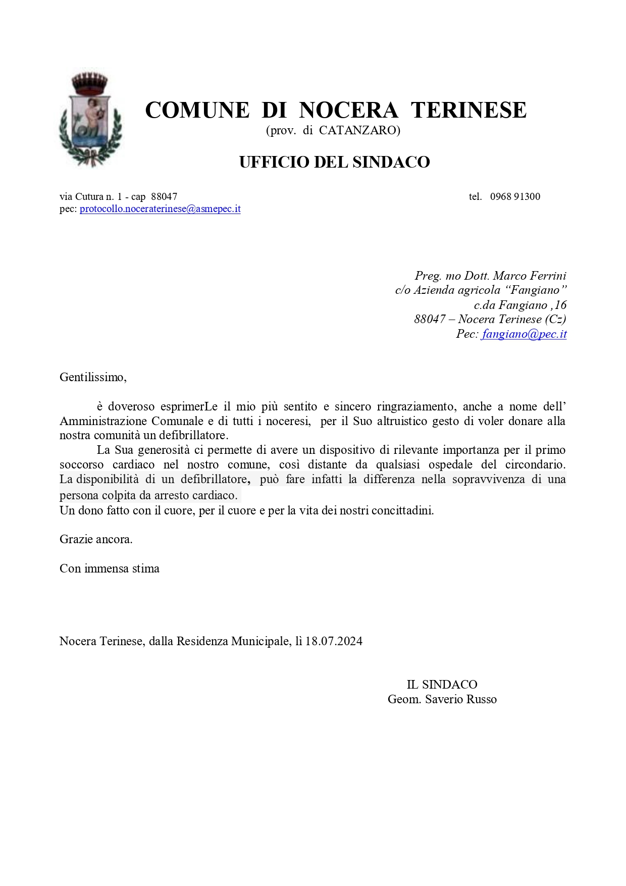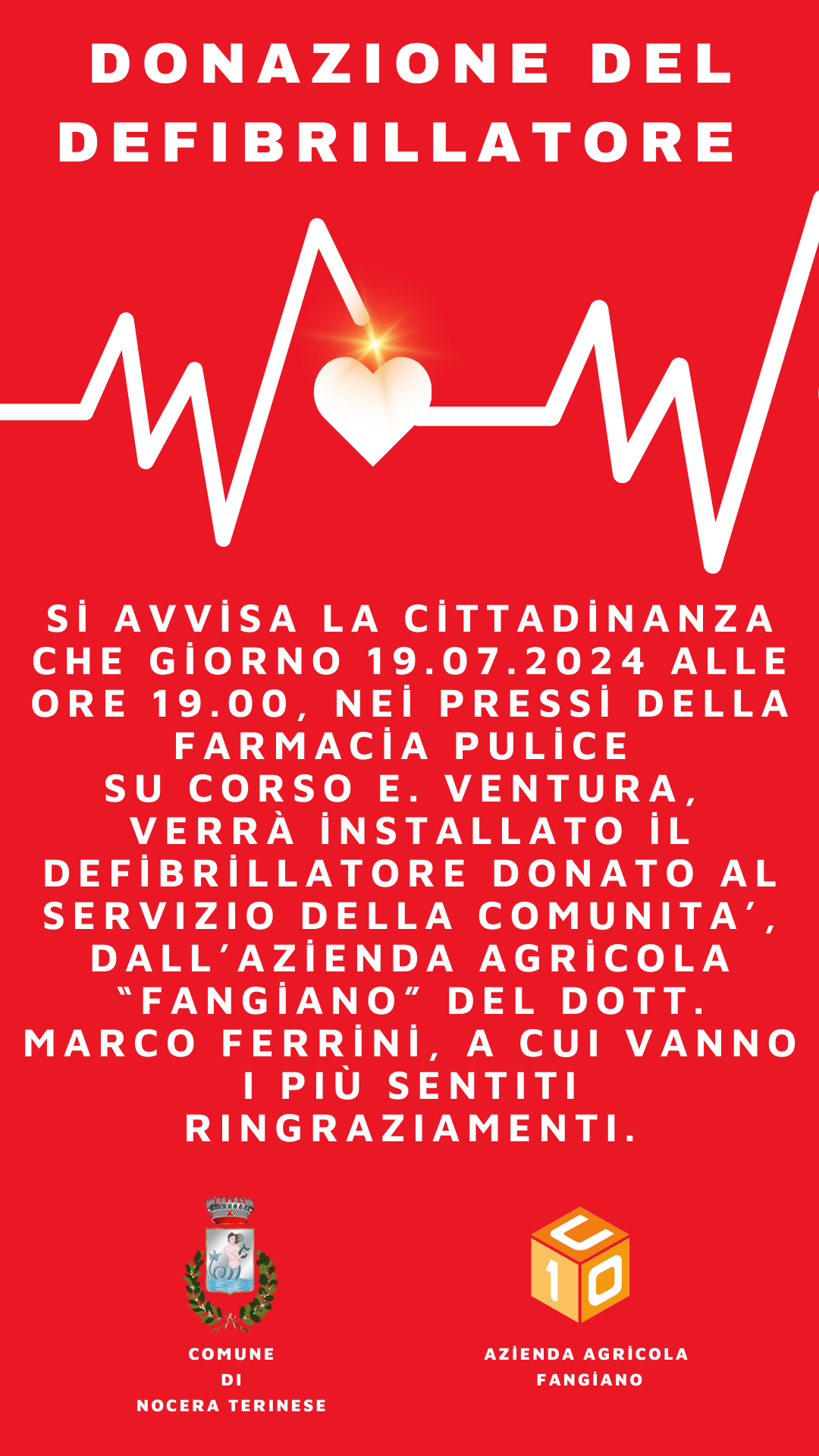 SI AVVISA LA CITTADINANZA CHE GIORNO 19.07.2024 ALLE ORE 19.00, NEI PRESSI DELLA FARMACIA PULICE SU CORSO E. VENTURA, VERRÀ INSTALLATO IL DEFIBRILLATORE DONATO AL SERVIZIO DELLA COMUNITA’, DALL’AZIENDA AGRICOLA “FANGIANO” DEL DOTT. MARCO FERRINI, A CUI VANNO I PIÙ SENTITI RINGRAZIAMENTI.