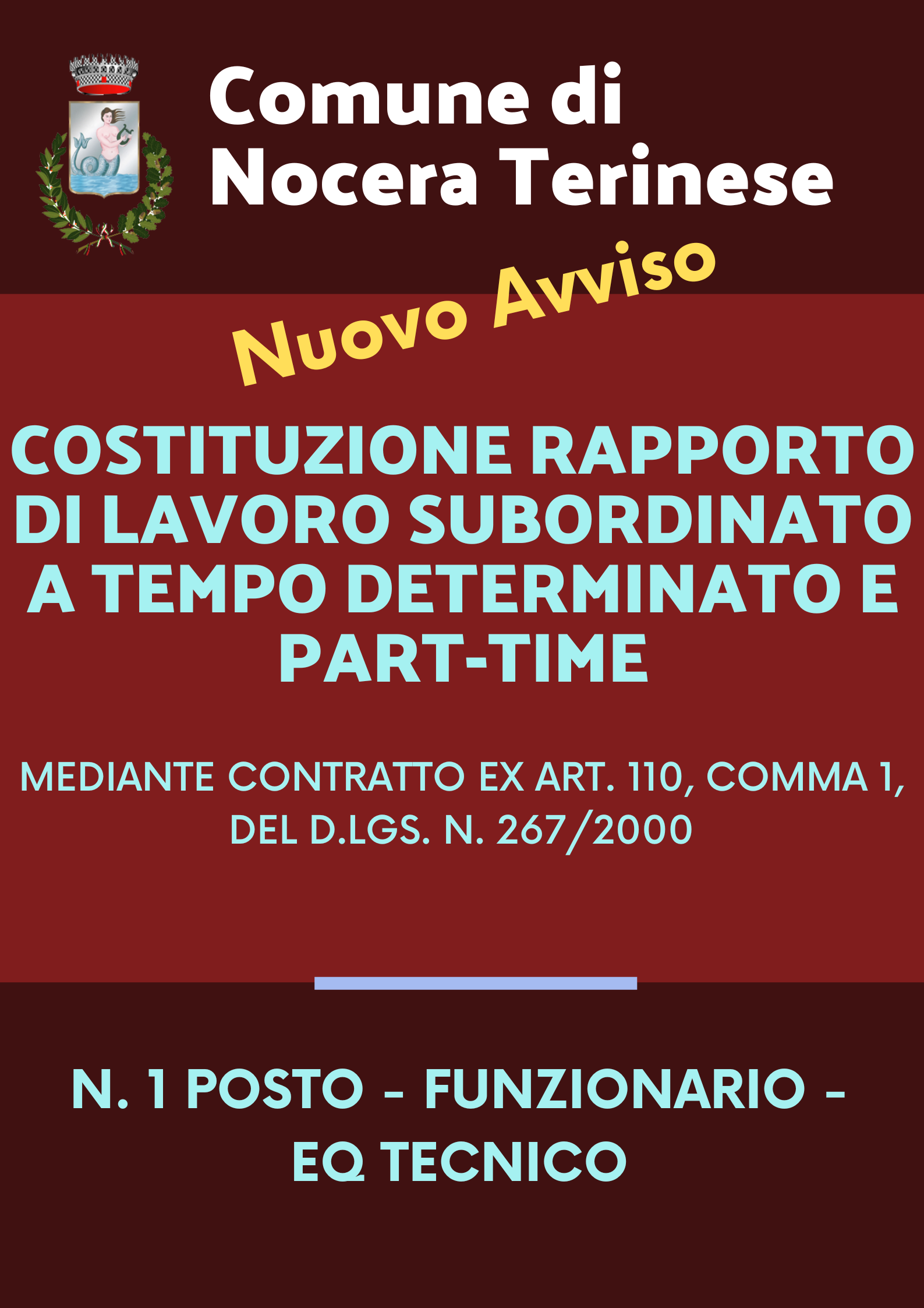 COSTITUZIONE RAPPORTO DI LAVORO SUBORDINATO A TEMPO DETERMINATO E PART TIME- 18 ORE SETTIMANALI- MEDIANTE CONTRATTO EX ART. 110, COMMA 1, DEL D.LGS. N. 267/2000 PER LA COPERTURA DI N. 1 POSTO IN DOTAZIONE ORGANICA DI FUNZIONARIO/EQ TECNICO, DA ASSEGNARE ALL' AREA URBANISTICA. APPROVAZIONE AVVISO PUBBLICO.