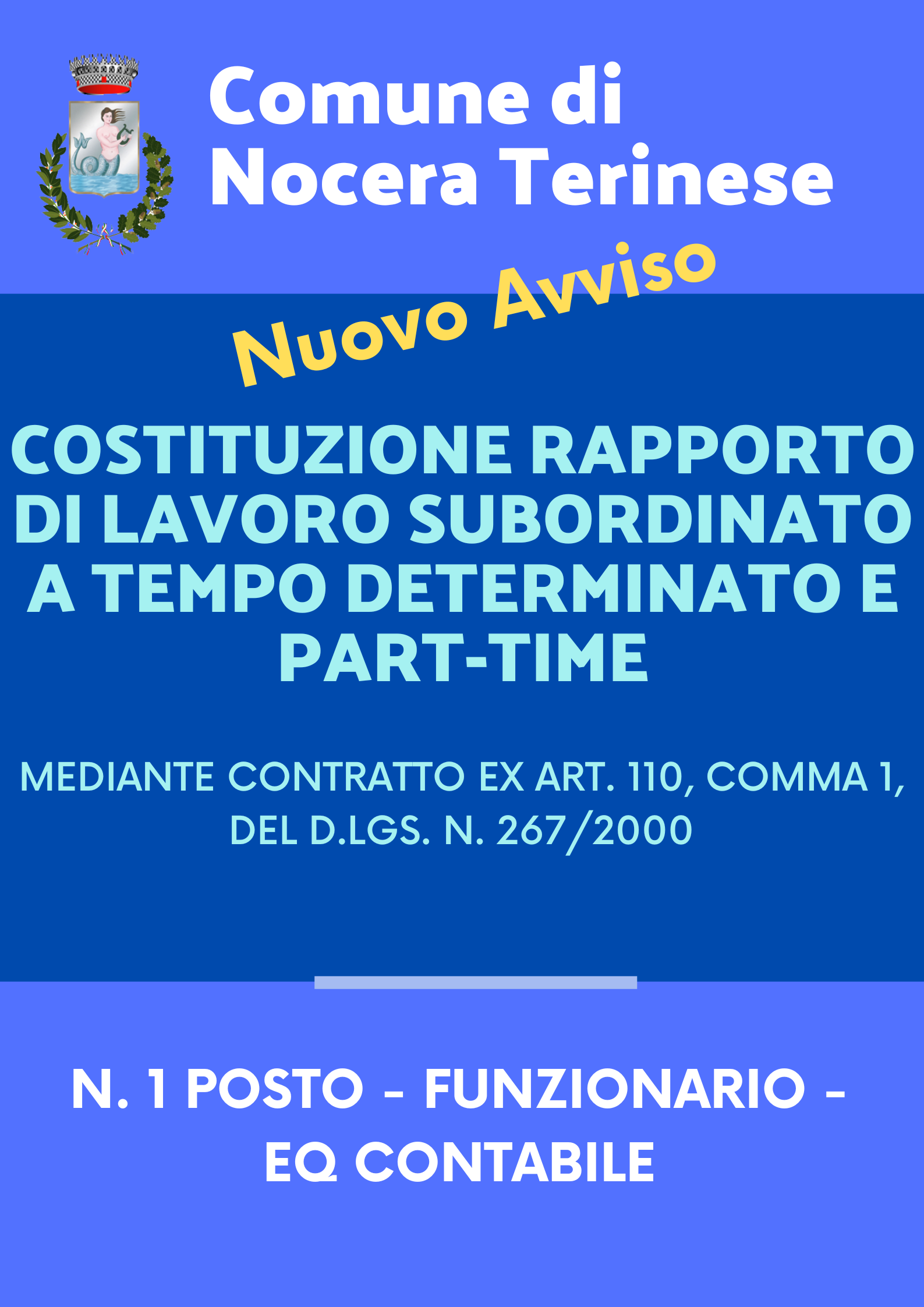 COSTITUZIONE RAPPORTO DI LAVORO SUBORDINATO A TEMPO DETERMINATO E PART TIME- 18 ORE SETTIMANALI- MEDIANTE CONTRATTO EX ART. 110, COMMA 1, DEL D.LGS. N. 267/2000 PER LA COPERTURA DI N. 1 POSTO IN DOTAZIONE ORGANICA DI FUNZIONARIO/EQ CONTABILE, DA ASSEGNARE ALL' AREA FINANZIARIA. APPROVAZIONE AVVISO PUBBLICO
