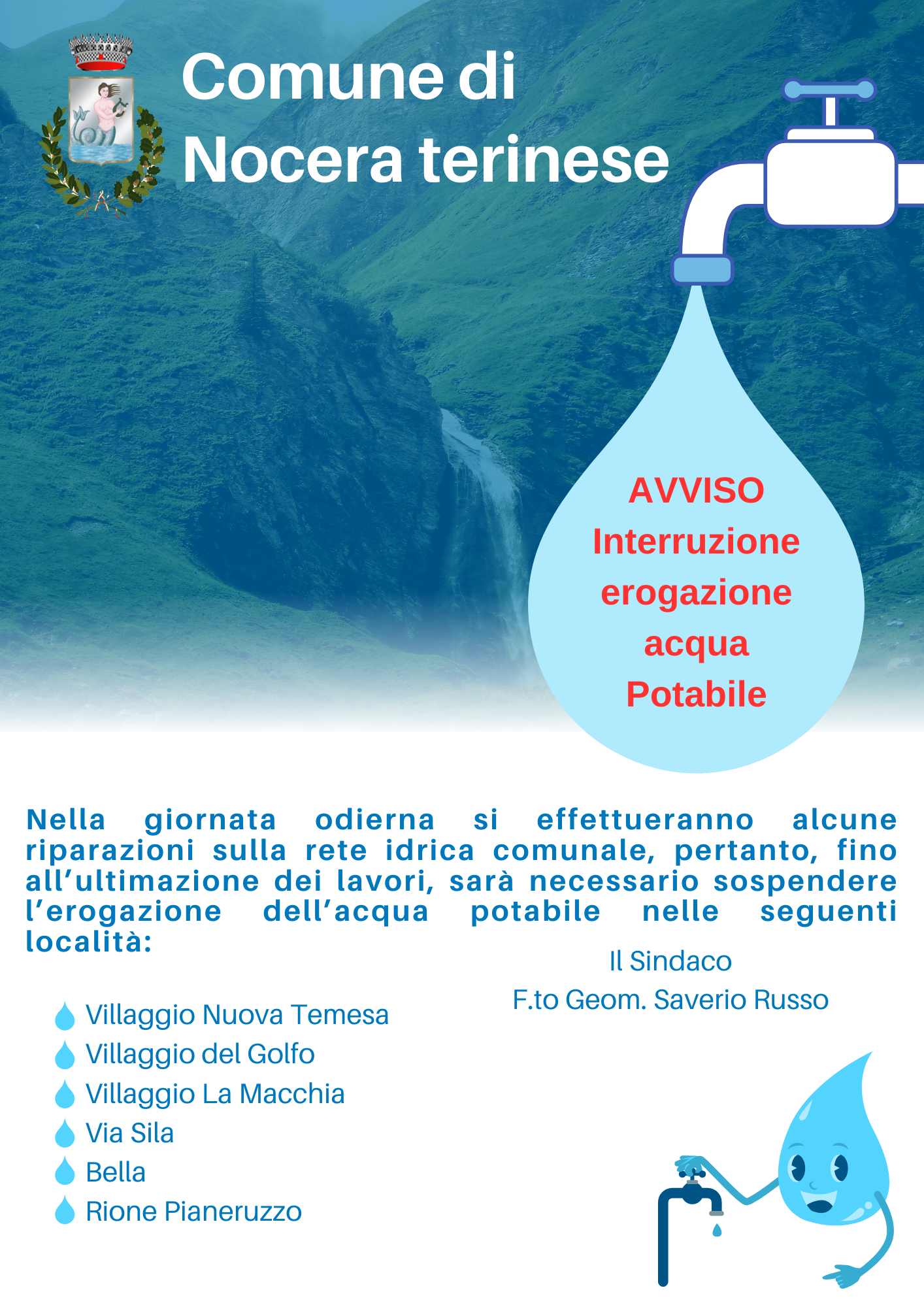 Nella giornata odierna si effettueranno alcune riparazioni sulla rete idrica comunale, pertanto, fino all’ultimazione dei lavori, sarà necessario sospendere l’erogazione dell’acqua potabile nelle seguenti località: