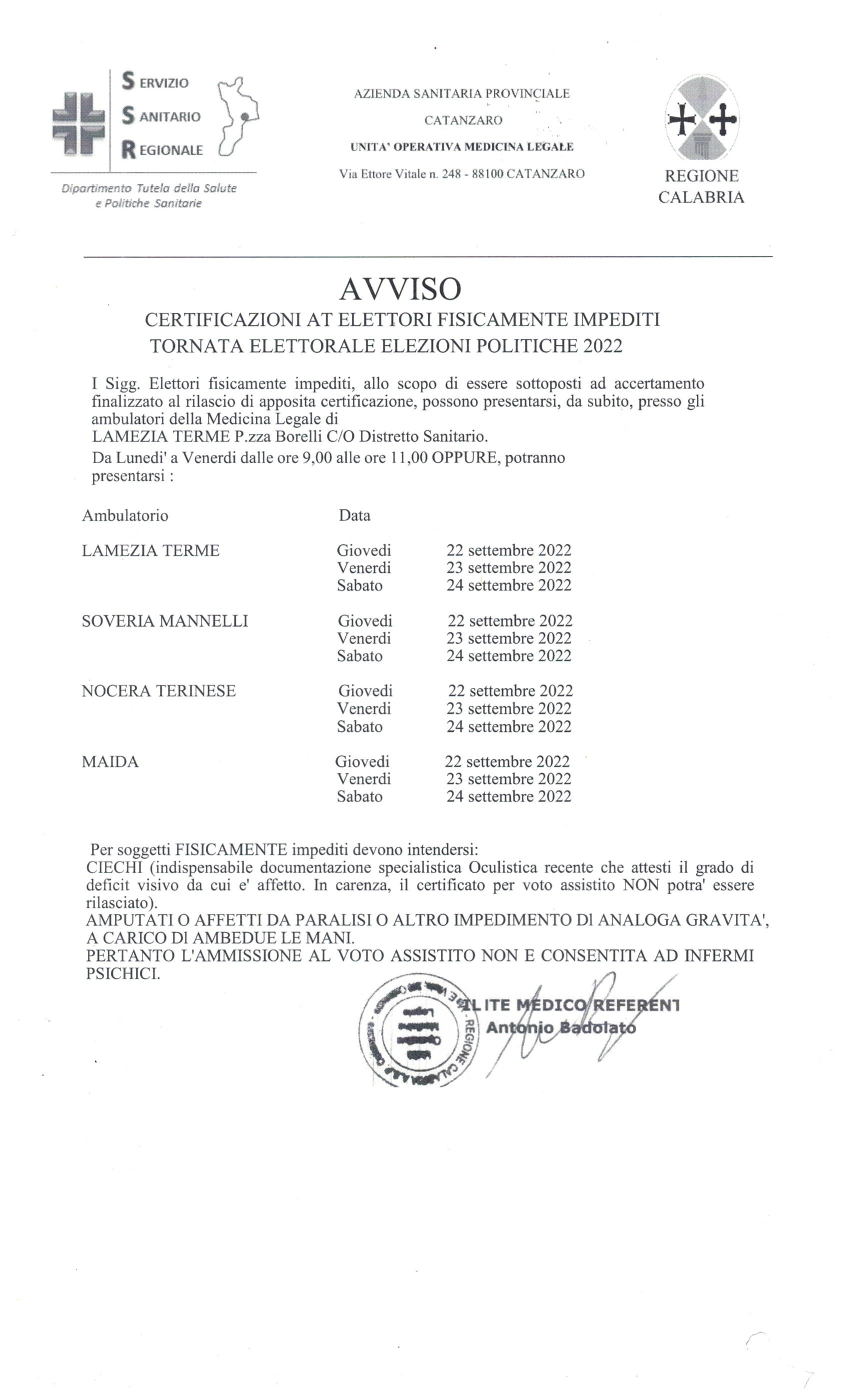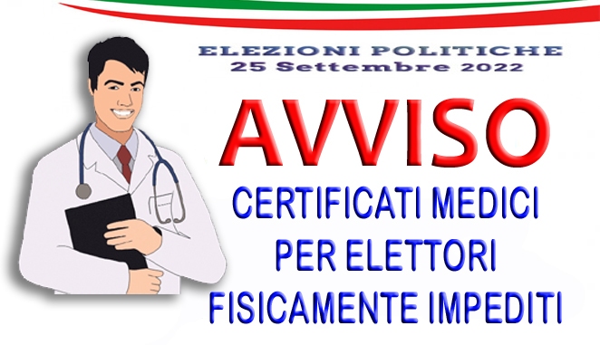 A seguito nota pec dell’ASP-Unità Operativa di Medicina Legale in data 18-08-2022 acquisita al protocollo dell’Ente in pari con n. 5887 si porta a conoscenza della cittadinanza che per le prossime elezioni della Camera dei Deputati e del Senato della Repubblica il servizio per il rilascio certificazioni agli Elettori fisicamente impediti, che devono espletare il diritto di voto, sara’ assicurato nei giorni di GIOVEDI’ 22 VENERDI’ 23 e SABATO 24 S et t e m b r e 2 0 2 2 presso gli Uffici Sanitari e nelle ore indicate in allegato come da circolare Prefettizia n. 90/2022