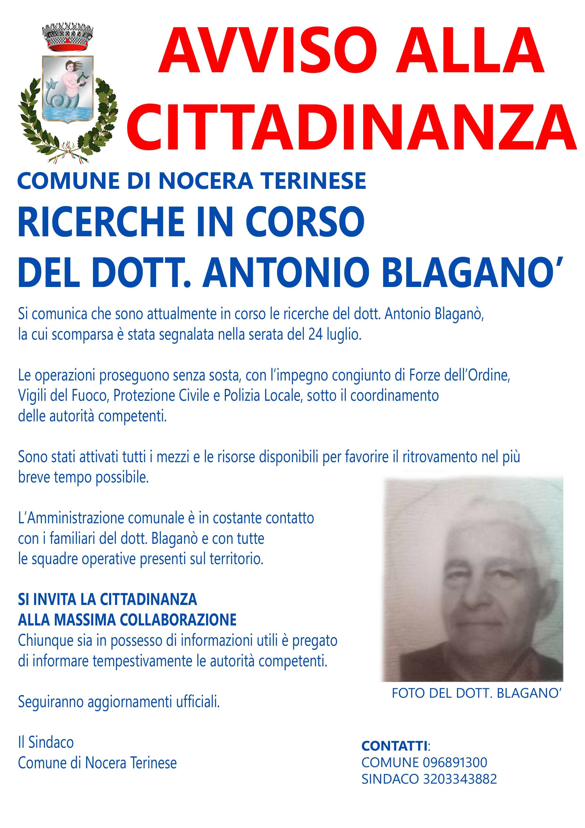 Si comunica che sono attualmente in corso le ricerche del dott. Antonio Blaganò, la cui scomparsa è stata segnalata nella serata del 24 luglio.