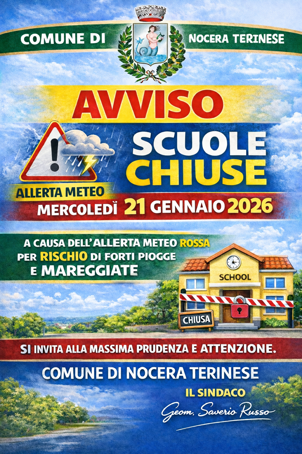 AVVISO - LA CHIUSURA DI TUTTE LE SCUOLE, DI OGNI ORDINE E GRADO PRESENTI NEL TERRITORIO DI QUESTO COMUNE